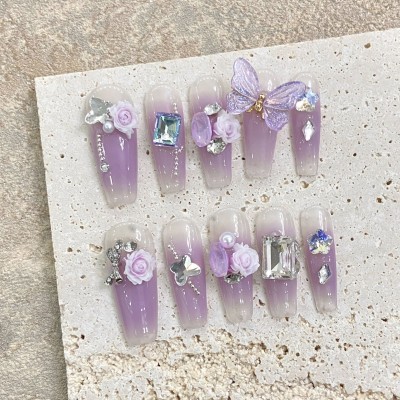 10pcs Rose Flower Press On Nails Handmade Crystal Butterfly Pearl Matal Bowknot Decor Fake Nail Gradient Purple Gentle Fake Nail
