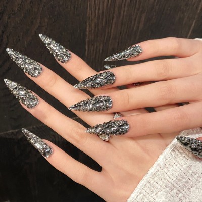 10pcs Luxury Dark Diamond Handmade Press On Nails Wearable Long Tip False Nails With Flash Rhinestone Decor Fake Nails Stiletto