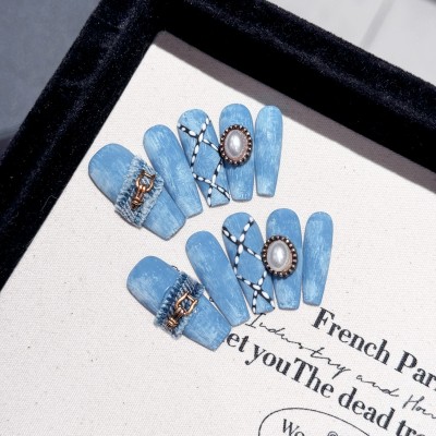 10pcsHandmade Press on Nails Blue Cowboy style Long Coffin Fake Nails for Girl Lady Wearable European Fashion False Nail Patches