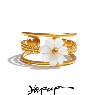 Yhpup Stainless Steel Natural Shell Flower Metal Hollow Open Ring 18K Gold Color Plated Popular Sweet Jewelry