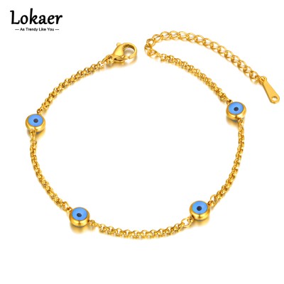 Lokaer Titanium Stainless Steel Chain Link Bracelet Vintage 18K Gold Plated Blue Turkish Eyes Charm Bracelet For Women B22037
