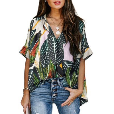Women's Hawaiian Shirts Leaves Printed Short Sleeve Tropical Button Down Shirt