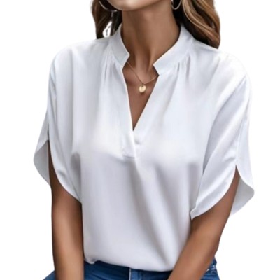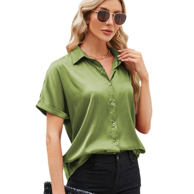 Satin Short Sleeve Loose Shirt Women's Casual Solid Color V-neck Button-up Shirt
