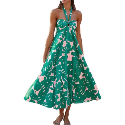 Summer Bohemian Printed Green Long Dress for Women Sexy Hanging Neck Casual Daily Wear