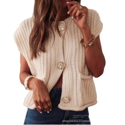 Pocket Sleeveless Short Knitted Vest for Women for Outer Wear