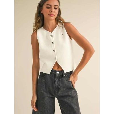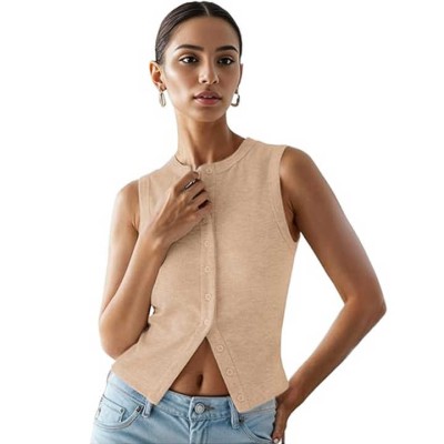 Women's Vest Top - Button-Up Sleeveless Round Neck Short Vest