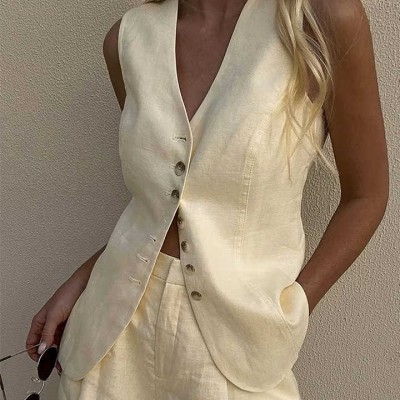 Summer Women's Commuting Casual Set Cotton Linen Sleeveless V-neck Suit Vest
