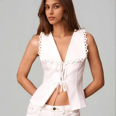 Women's Elegant Casual Slim Fit Sleeveless Top with White Lace Trim Waistcoat