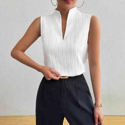 Breathable High Neck Casual Style Tank Tops White Sleeveless Vest with Ruched Print Decoration
