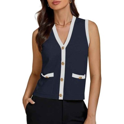 Trendy Colorblock Button Down Dressy Casual Sleeveless Summer Sweater Vest with Pockets for Spring Season