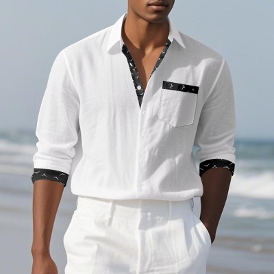 linen long-sleeve mens shirt simple printed lapel casual t-shirt bottoming shirt