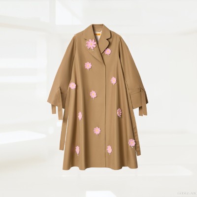 Pink 3D flower Loose Long trench Coat with lacing Solid Color V-Neck