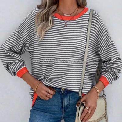 Autumn Casual Knitted Breathable Striped Loose Regular Sleeve Crew Neck Women's Sweater Top