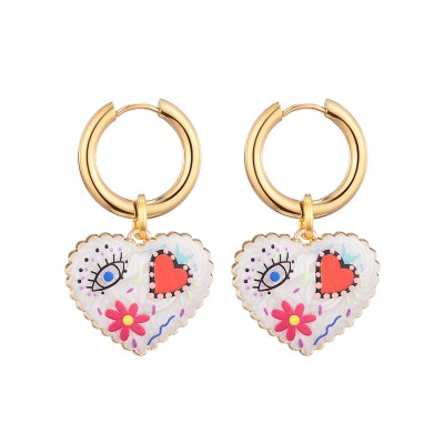 New Cute Heart Eye Flower Pattern Stainless Steel Hoop Women's Earrings Vintage Enamel Gold Color Lovely Pendant Female Jewelry