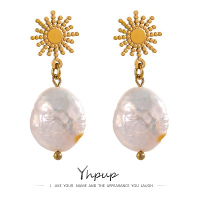 Yhpup Natural Freshwater Pearl Dangle Earrings Stainless Steel Sun Celestial Hanging Earrings for Women Aretes De Mujer Gift