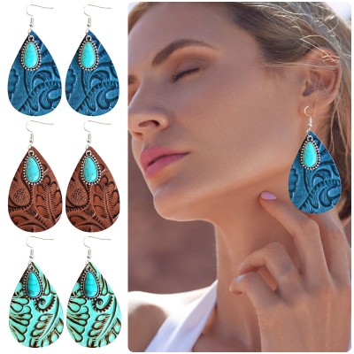 Valentine Earrings For Girls Vintage Embossed Leather Water Drop Shape Blue Turquoise Stone Dangle Earrings For Earring Jewelry