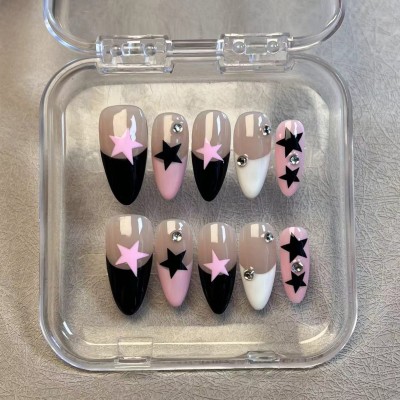10pcs Handmade Press On Nails Black White Pink French Style False Nails Paches Star Designs Wearable Almond Fake Nail For Women