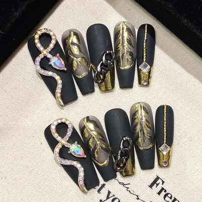 Handmade Press On Nails Dark Black Long Coffin False Nail Tips 3D Diamond Snake Chain Decor Halloween French Style Fake Nails