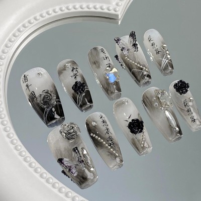 10pcs Handmade Fake nails Black Camellia Flowers Design False Nails New Chinese Gradient Black Clear Butterfly Press on Nails