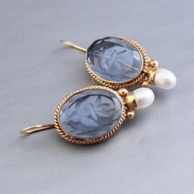 Fashion Retro Style Round Green Carving Crystal Stone Pearls Dangle Earrings For Women Girl Party Accessories Jewelry 2024 New