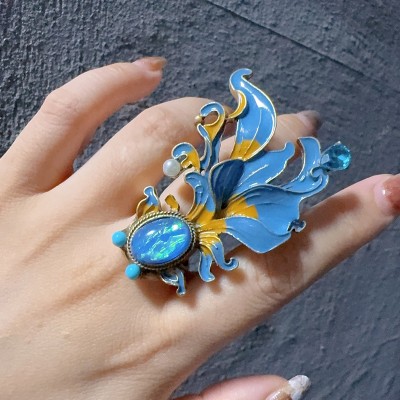 Vintage Fish Ring Jewellery Goldfish Enamel oval Blue Opal