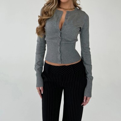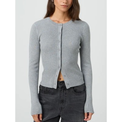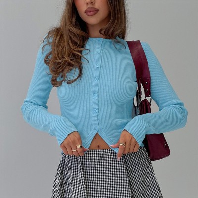Long Sleeve Round Neck Button Up Ribbed Knitwear
