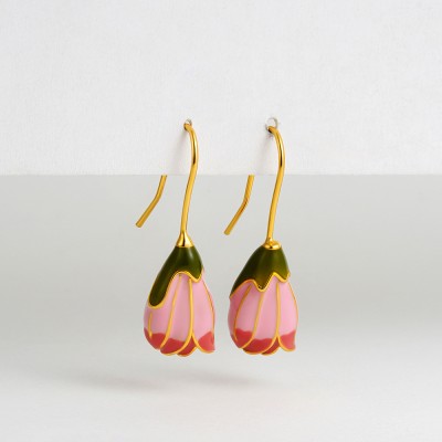 Vintage Fresh Pink Enamel Tulip Flowers Long Tassel Drop Dangle Earrings