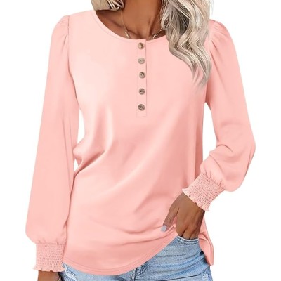 Women's Long Sleeve Henley Tops Smocked Puff Sleeve Tops Casual Shirts Blouses Street Wear