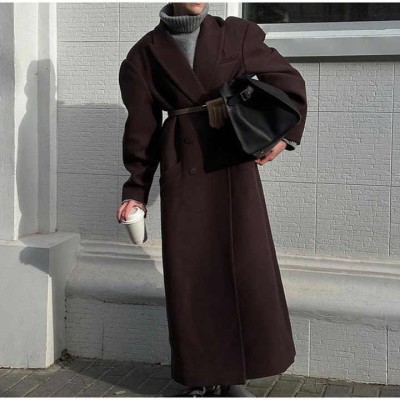 Fashion Long Sleeved Solid Color Women's Casual Overcoat Lady Streetwear Flip Collar Double Breasted Pocket Woolen Coat