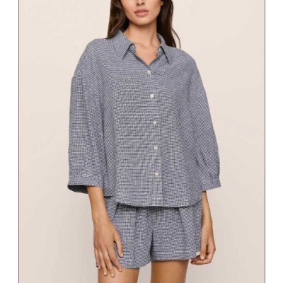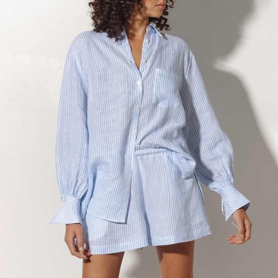 Women's Clothing Women Long Sleeve Short Pant Shirt Outfit Cotton Stripe Women's
