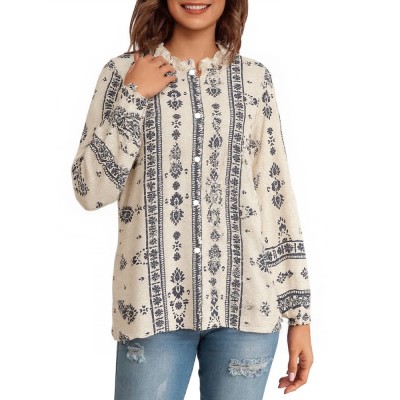 Vintage Women Printed Lantern Sleeve Shirt Office Lady Elegant Tops Fashion Button Up Long Sleeve Blouses