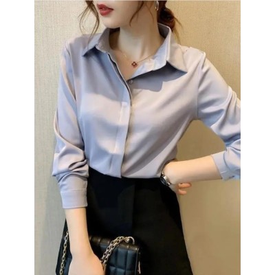 Autumn solid colour long-sleeved versatile shirt lapel satin shirt women