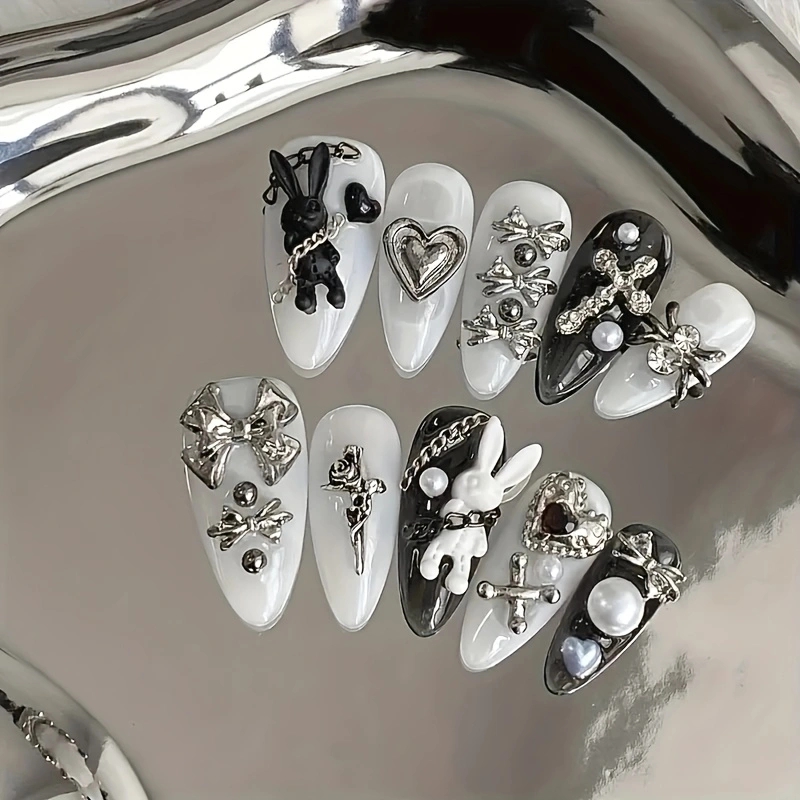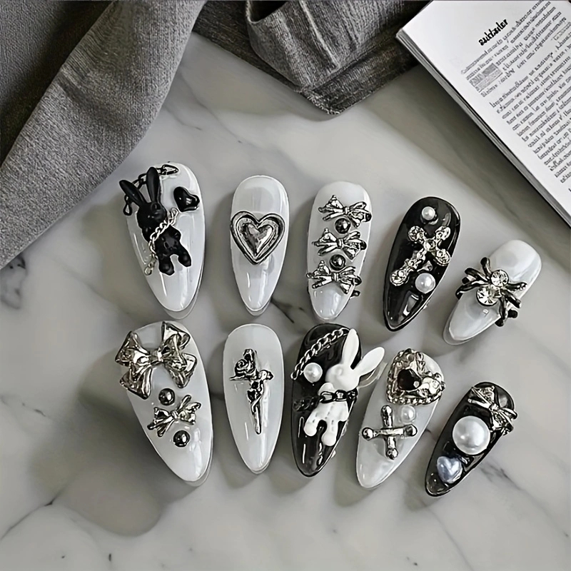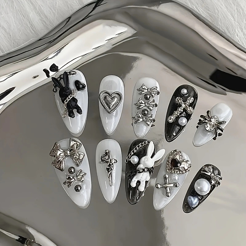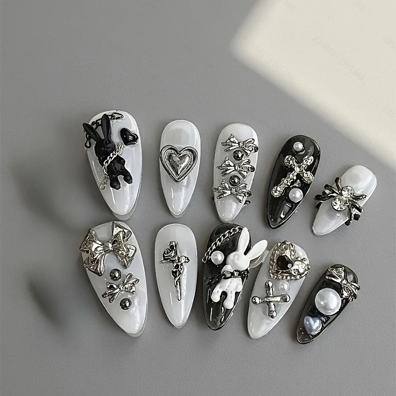 10pcs personalized black and white nail art, rabbit and bow decoration - Gothic minimalist style, suitable for daily wear