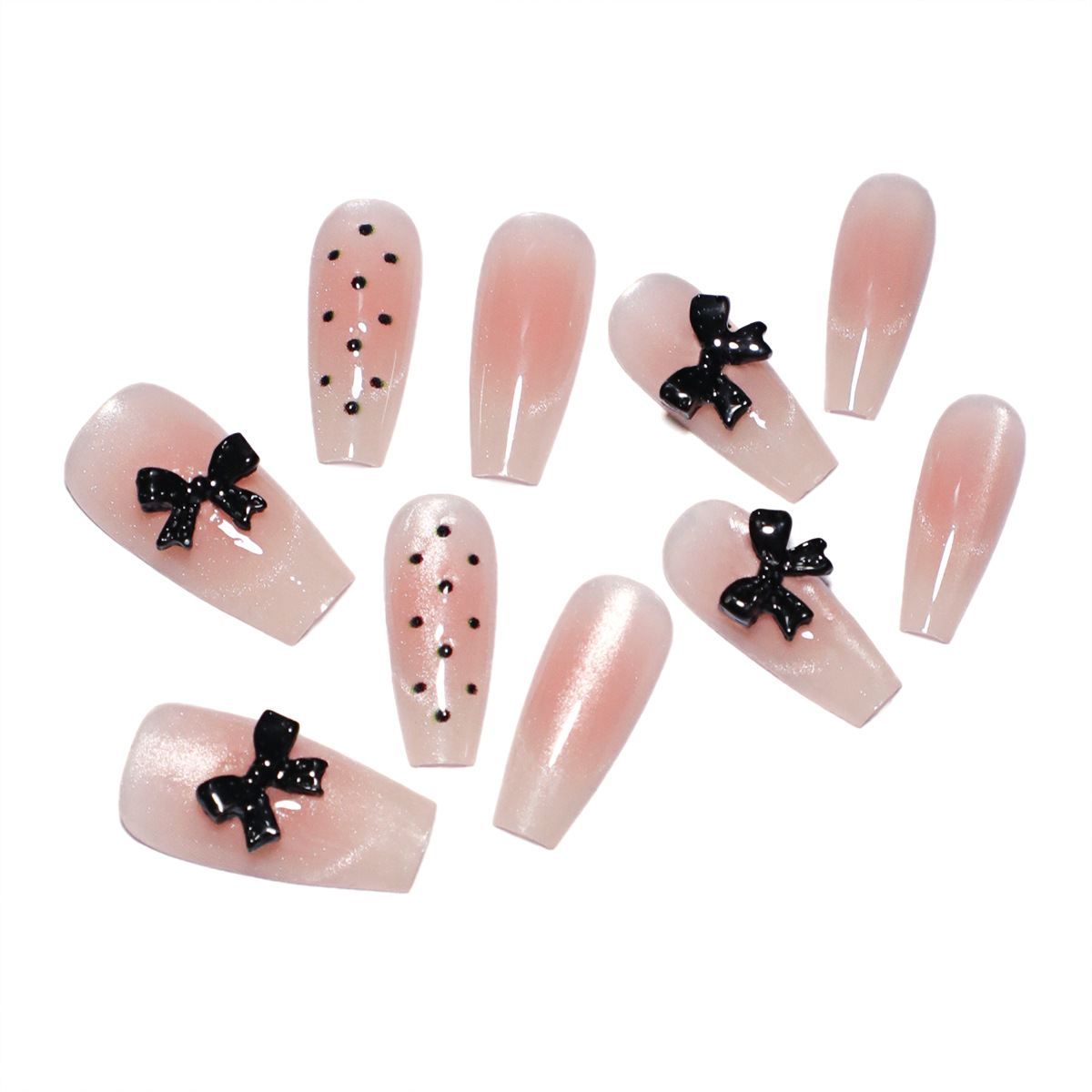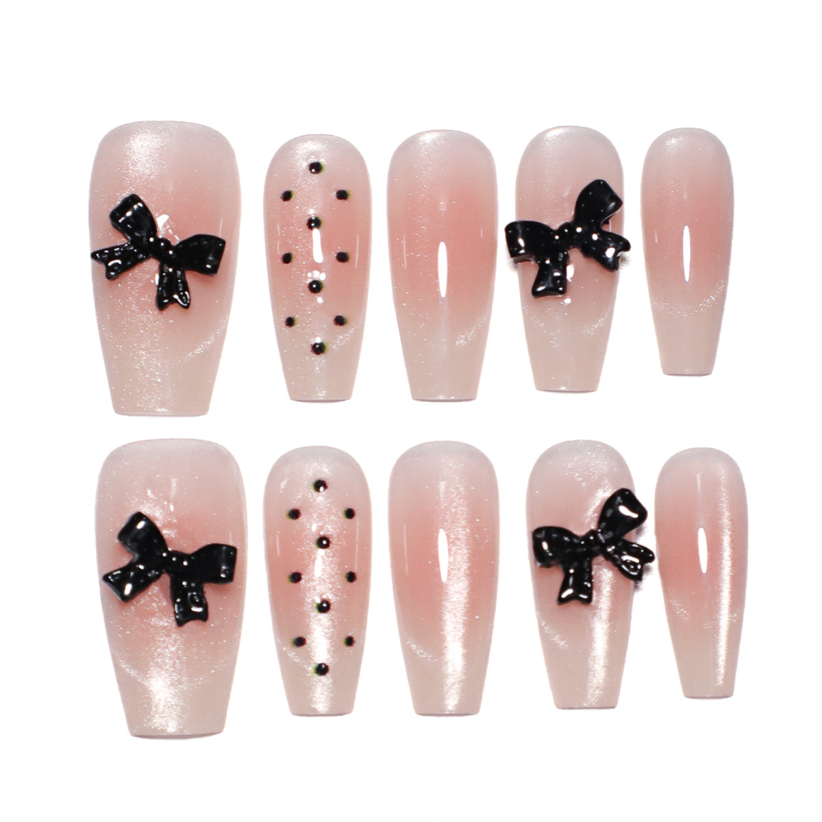 Handmade Press on Nails Shiny Pink Cat Eye False Nails with Black Bow Design Korean Sweet Style Coffin Shaped Fake Nail Tips