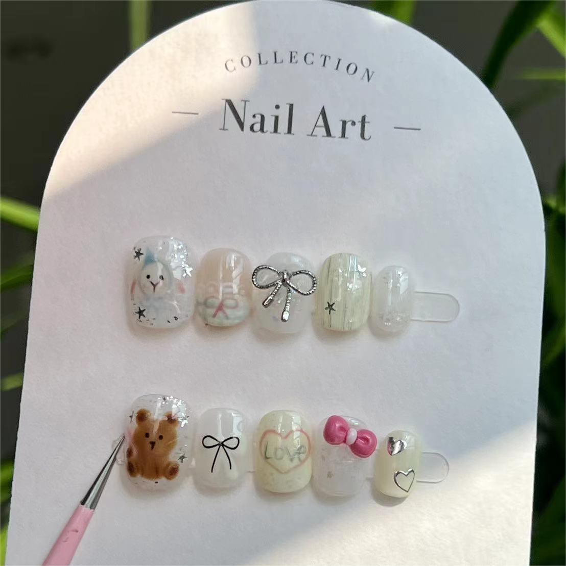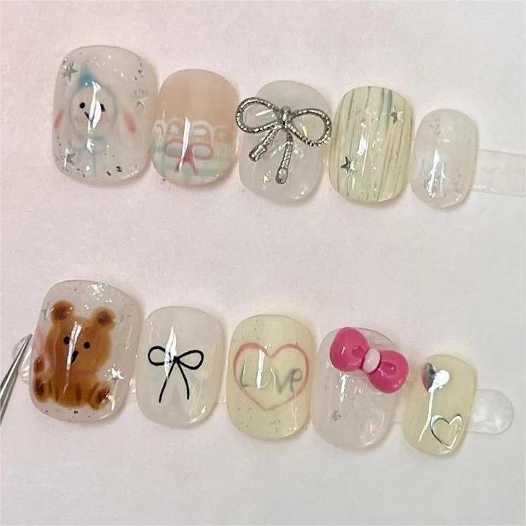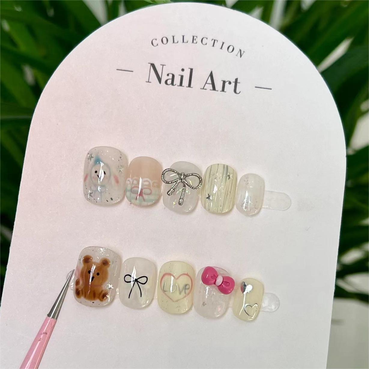 Summer Sweetheart Handmade Wear Nail Bright Glitter Hand-painted Cartoon Cute Short Fake Nails Bowknot Love Bear Lace Edge Sweet Sexy Press On Nails