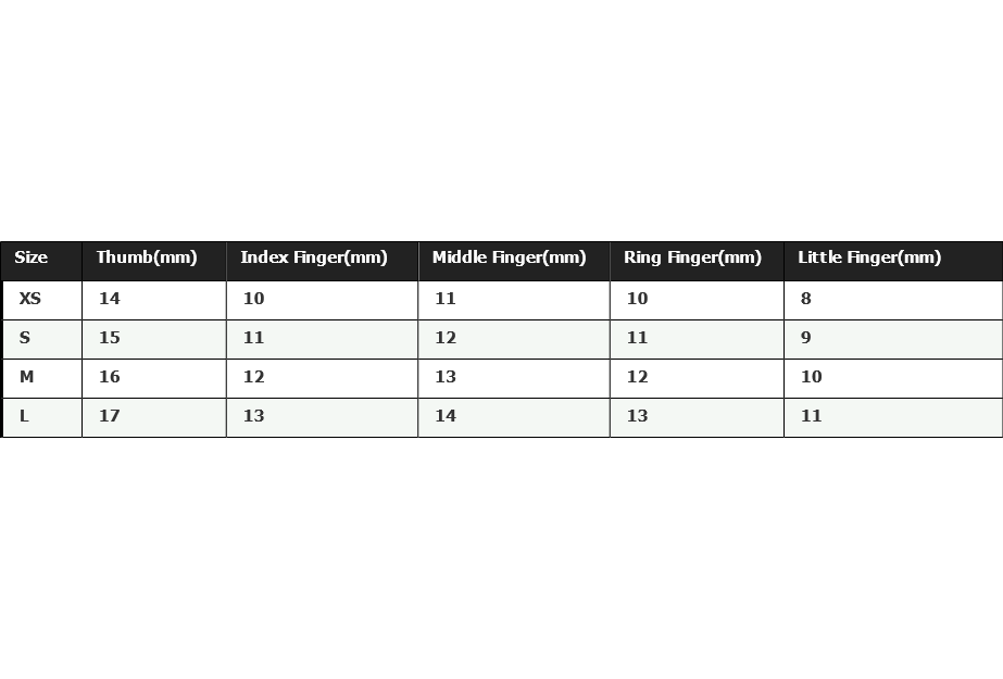 Size,Thumb(mm),Index Finger(mm),Middle Finger(mm),The Fourth Finger(mm),Little Finger(mm)