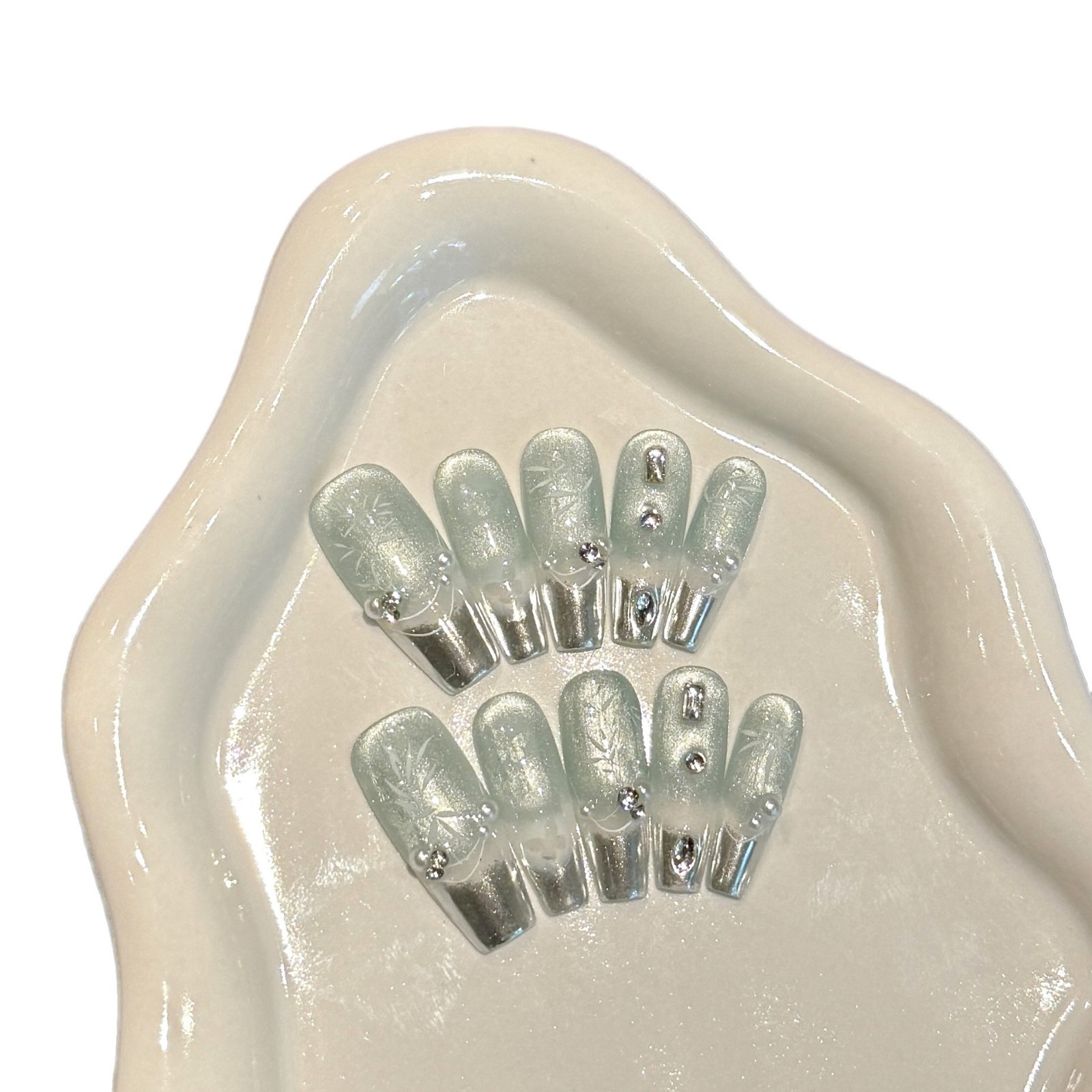 10pcs Handmade press On Nails New Chinese Style Silver French Tips Fake Nail Hand-painted Bamboo Leaf Pearl Diamond False Nails