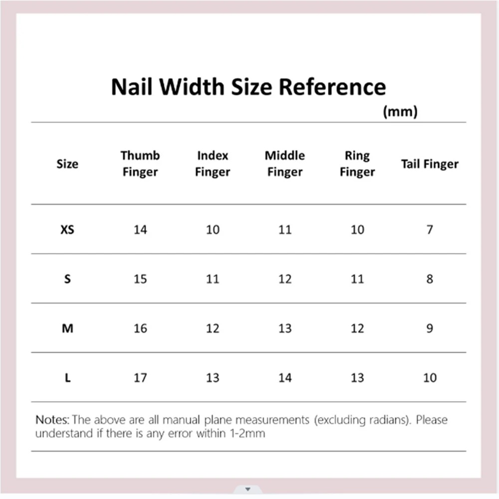 Firstly, when choosing to wear pressure nails, size must be the first choice, because wearing pressure nails is a finished product, and the seller does not know the size of your nail plate, so each person's pressure nail size is different. Generally speaking, there are four main types of nail sizes on the market. The XS/S/M/L four sizes are suitable for the vast majority of people.