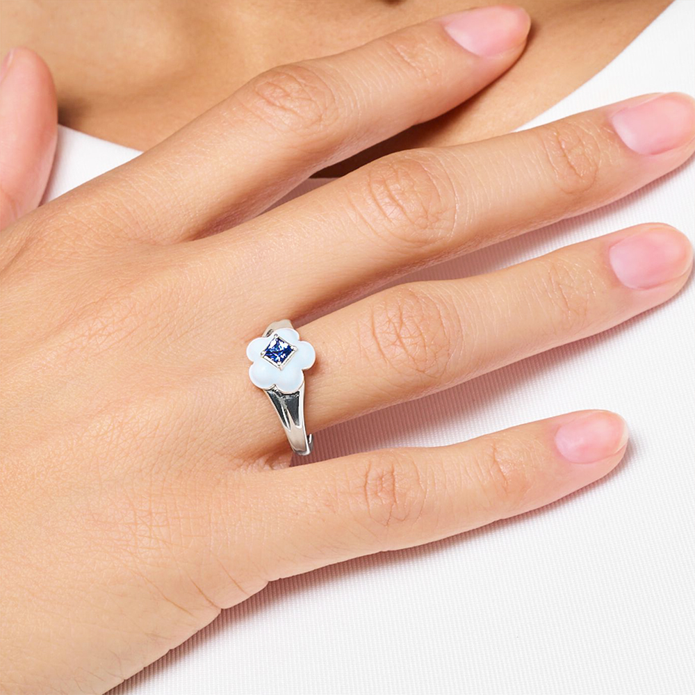 Pop Colours: This ring made of 925 Sterling silver features a three-dimensionally designed flower. It is richly detailed with fine engraving lines and hand-painted with cold enamel in pastel light blue. The radiant centre of the flower is a dark blue princess-cut stone. The ring has a gently rounded shank for great wearing comfort. This special piece of jewellery makes an excellent gift for favourite people. Perfect combination partners are the necklace, bracelet and ear studs in the same design.