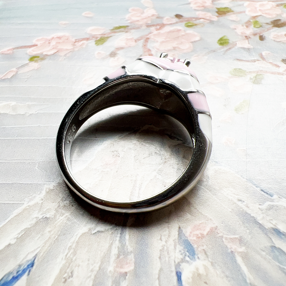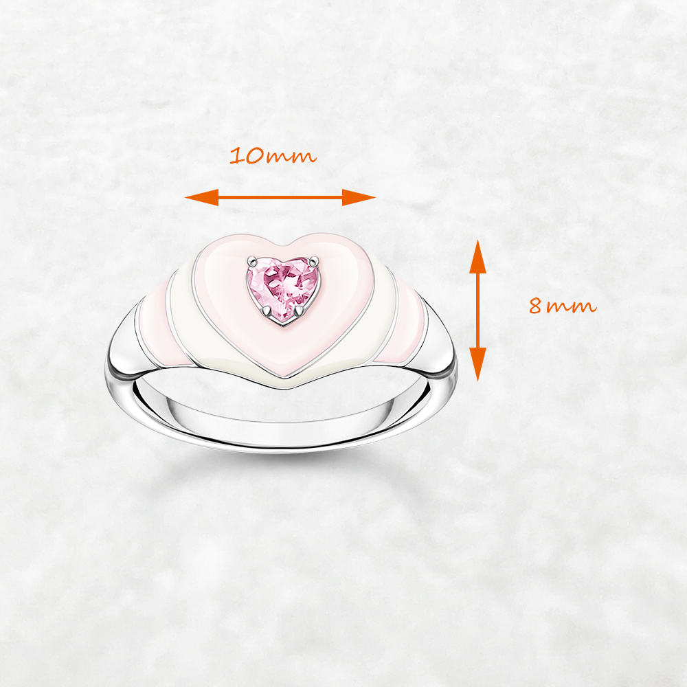 Pop Colours: The ring is made from high quality 925 Sterling silver and adorned with a three dimensional heart. This is hand-painted with cold enamel in a pastel shade of pink ice cream. A radiant pink heart-cut zirconia stone is set in its centre. The ring shaft is richly detailed with fine engraving lines and lavishly decorated with cold enamel in white and pink. It is gently rounded for great wearing comfort.