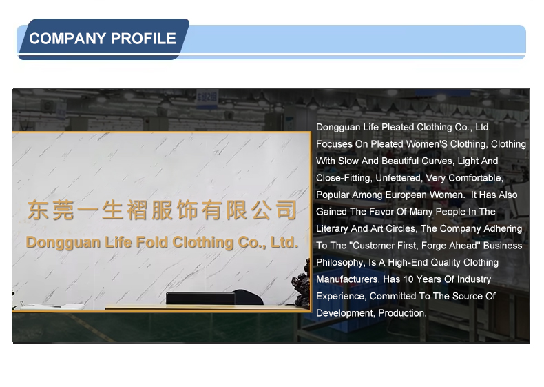 Focus on pleated women's wear, with 10 years of industry experience. Invest heavily in the research and development and reform of style, fabric, craft and vision every year! Strength and product quality have been widely recognized by the clothing industry