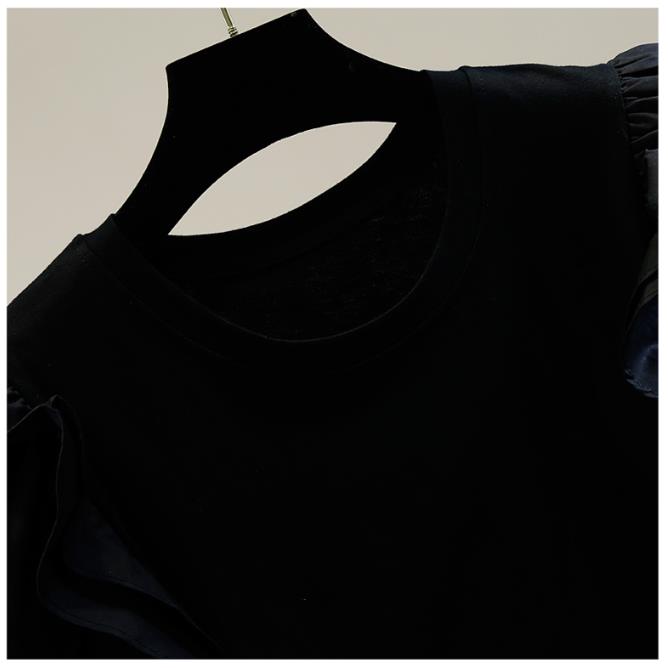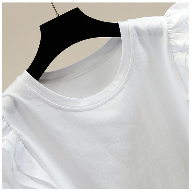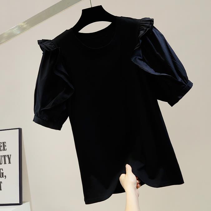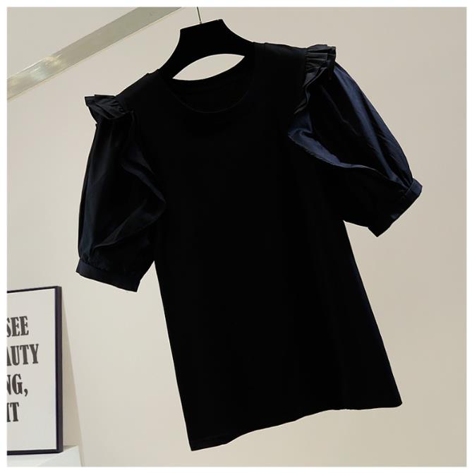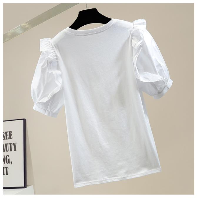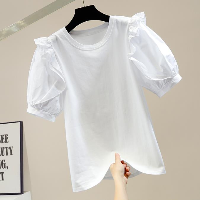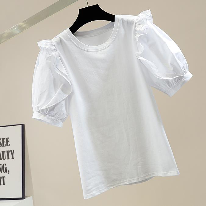 Retro Lantern Sleeve Sweet T Shirt Women's Pleated Wooden Ear Stitching T-shirt Female Fashion Round Neck Top |