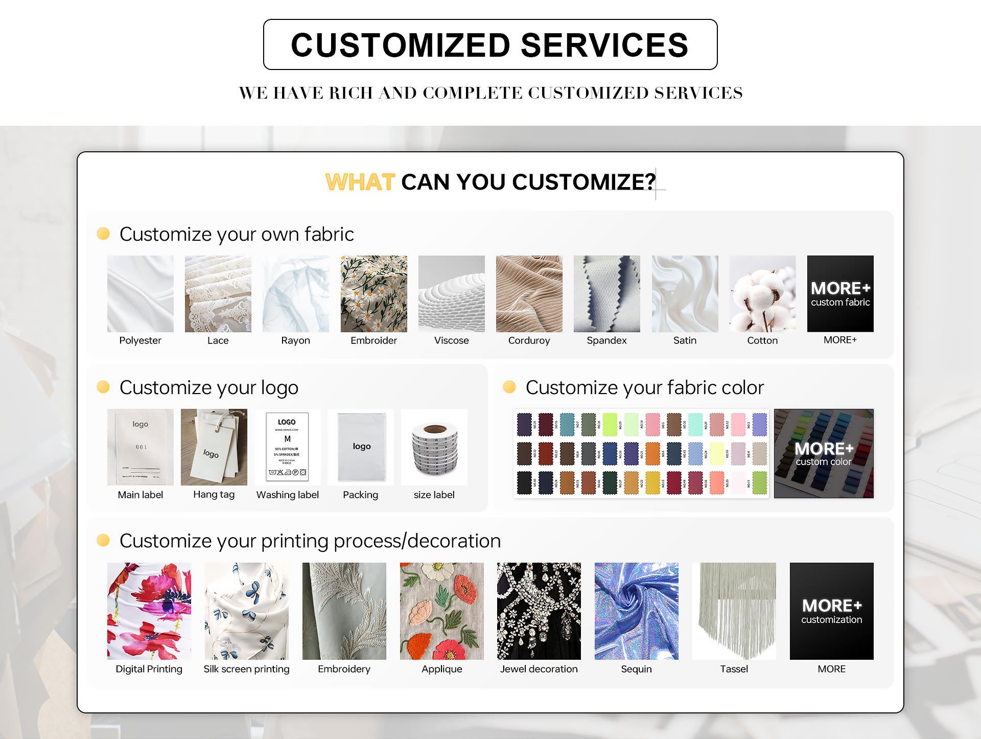 Cotton, Linen, Chiffon, Tweed, Velvet, Jacquard, Satin, Silk, etc.