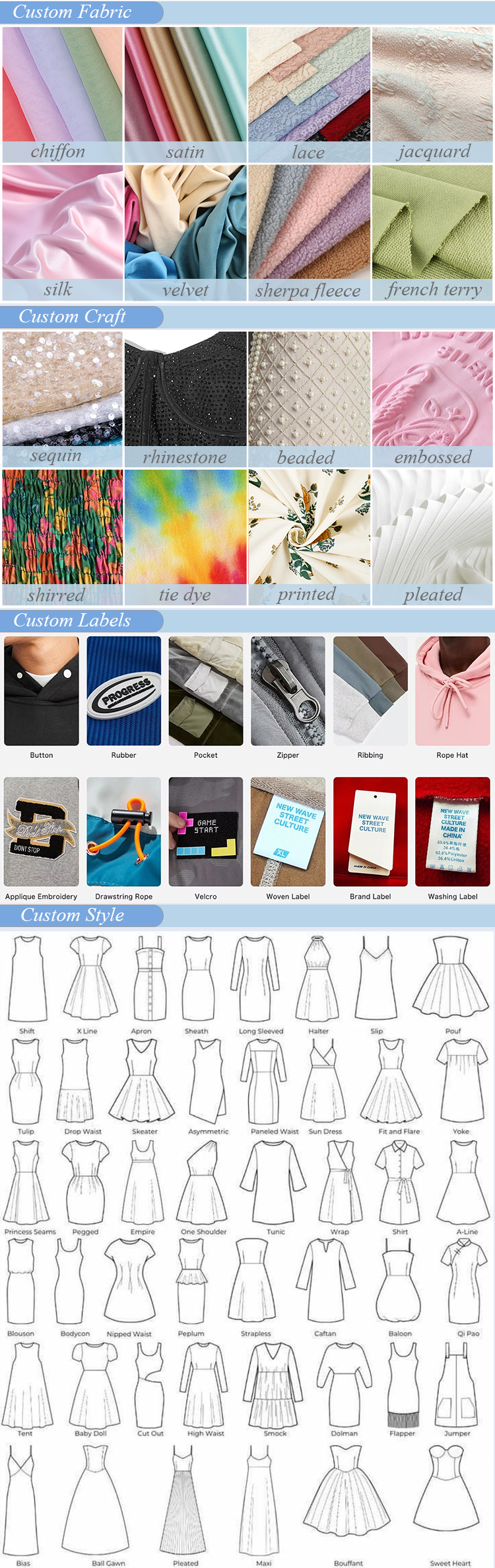 Color, Size, Fabric, Craft(more than 15 crafts), Logo, Label, Package