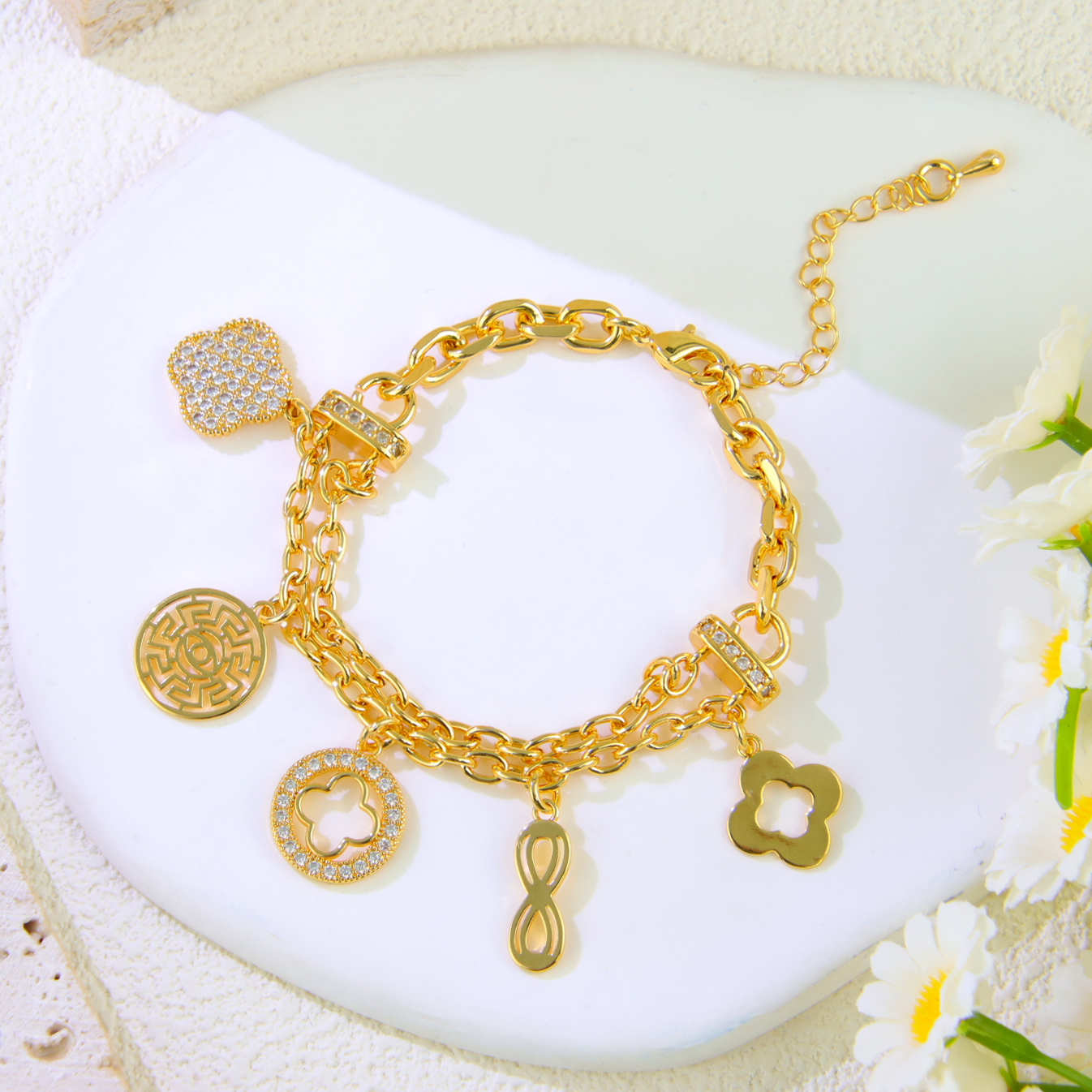 Title: Fashion 21K Gold Plated Dubai Gold Bracelet Women Hand Lin Chain Bracelet With Zircon