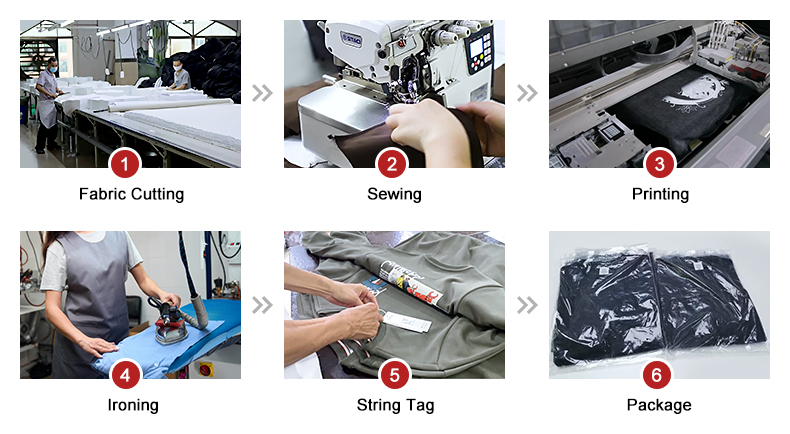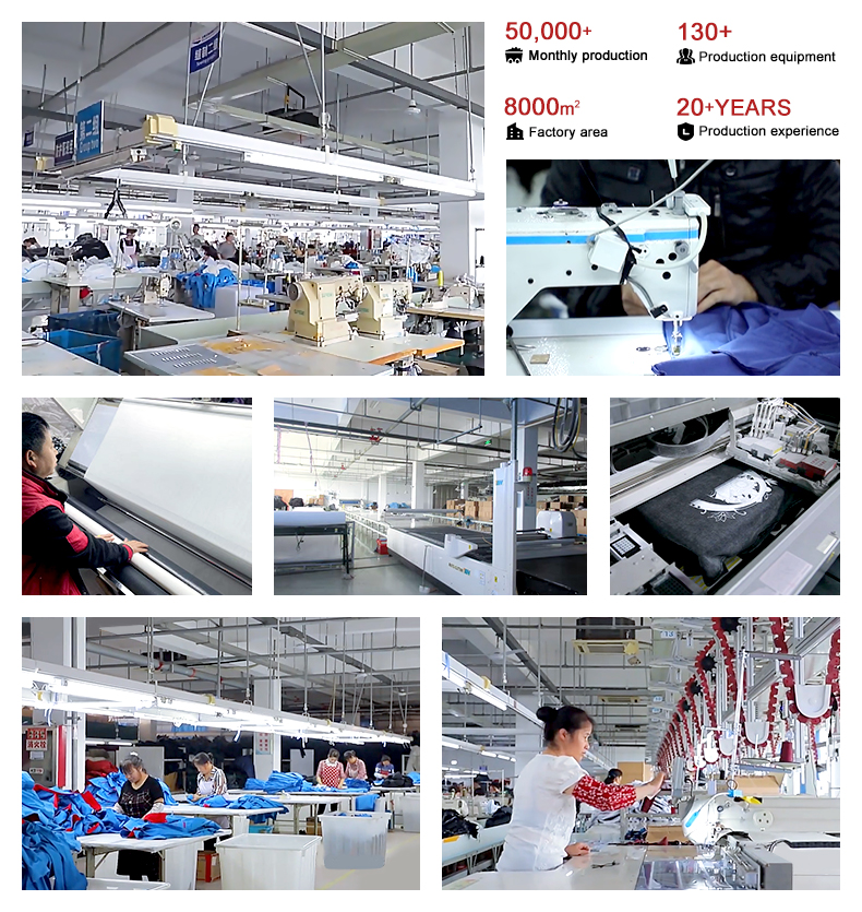 Our company was founded in 2004. The core team is a well-known garment enterprise, we have 8000square meters of garment factory in Guangdong Province, rich production experience, professionalproduction research and development and quality inspection team, we are based on providing customerswith high-end products and professional services. Our company has a variety of clothing styles for you tochoose from, support OEM/ODM customization, support very low MOQ, and provide a variety of customprinting processes to meet the various needs of diferent customer groups. Sincerely look forward tocooperating with you, please contact us for more information!