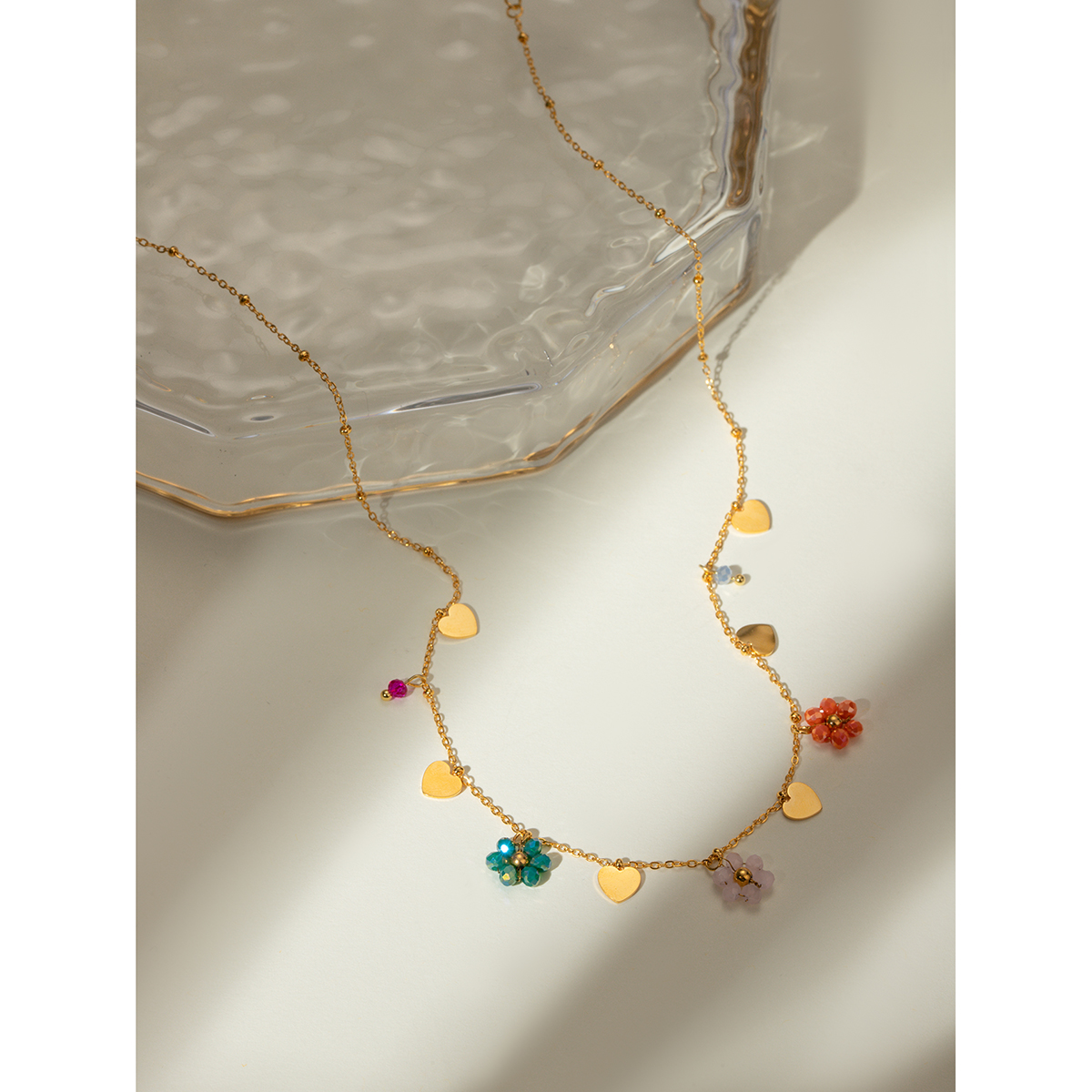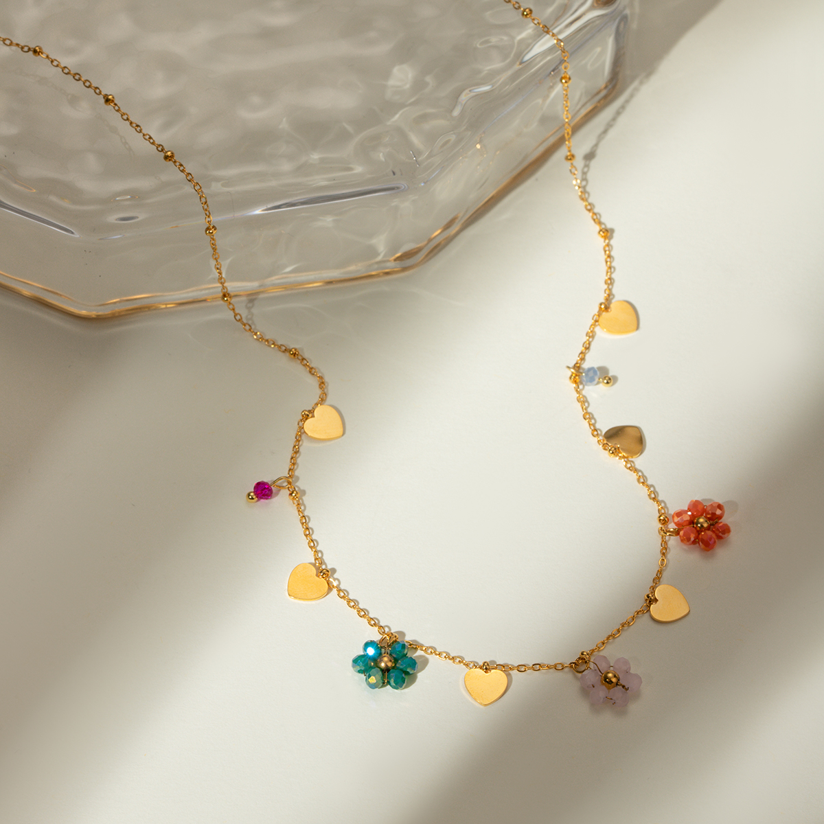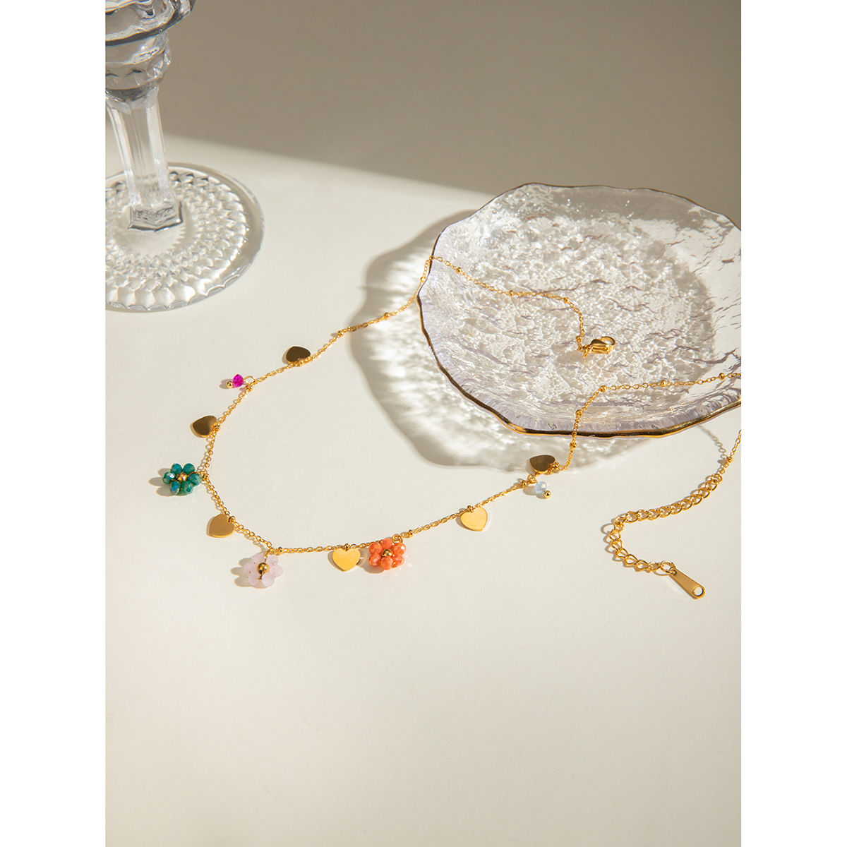 J&D Stainless Steel Chain Colorful Summer Glass Beads Flower Heart Charms Dainty Necklace for Girls