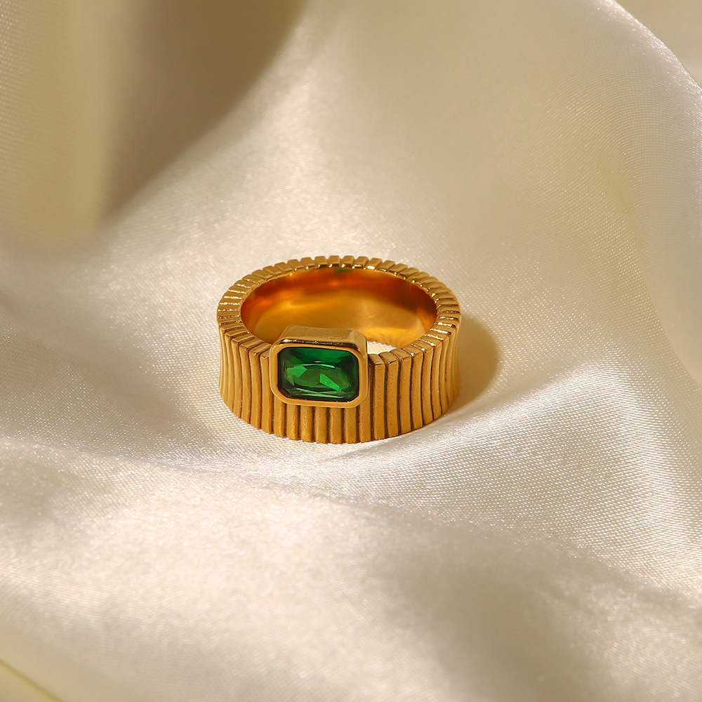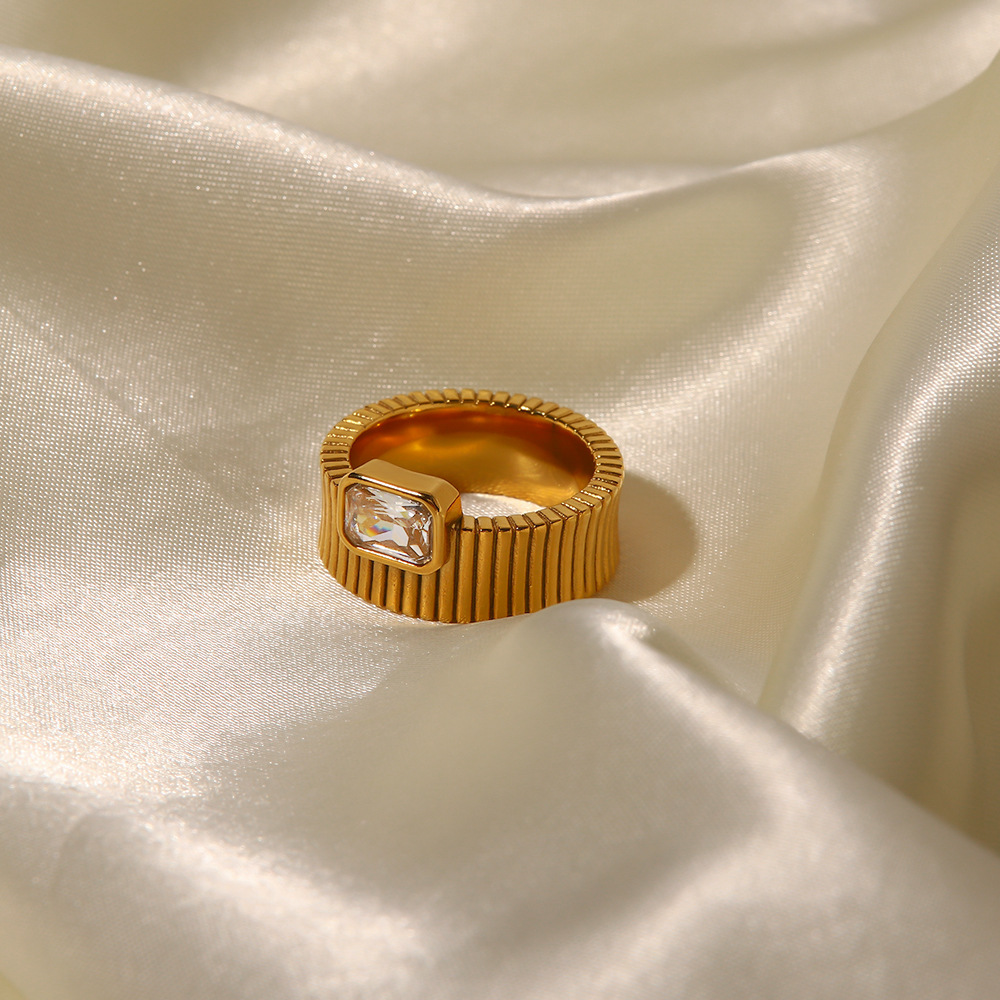 Women Constant Color Square Rhinestone Vertical Ring Strong French Retro Zircon Ring Stainless Steel