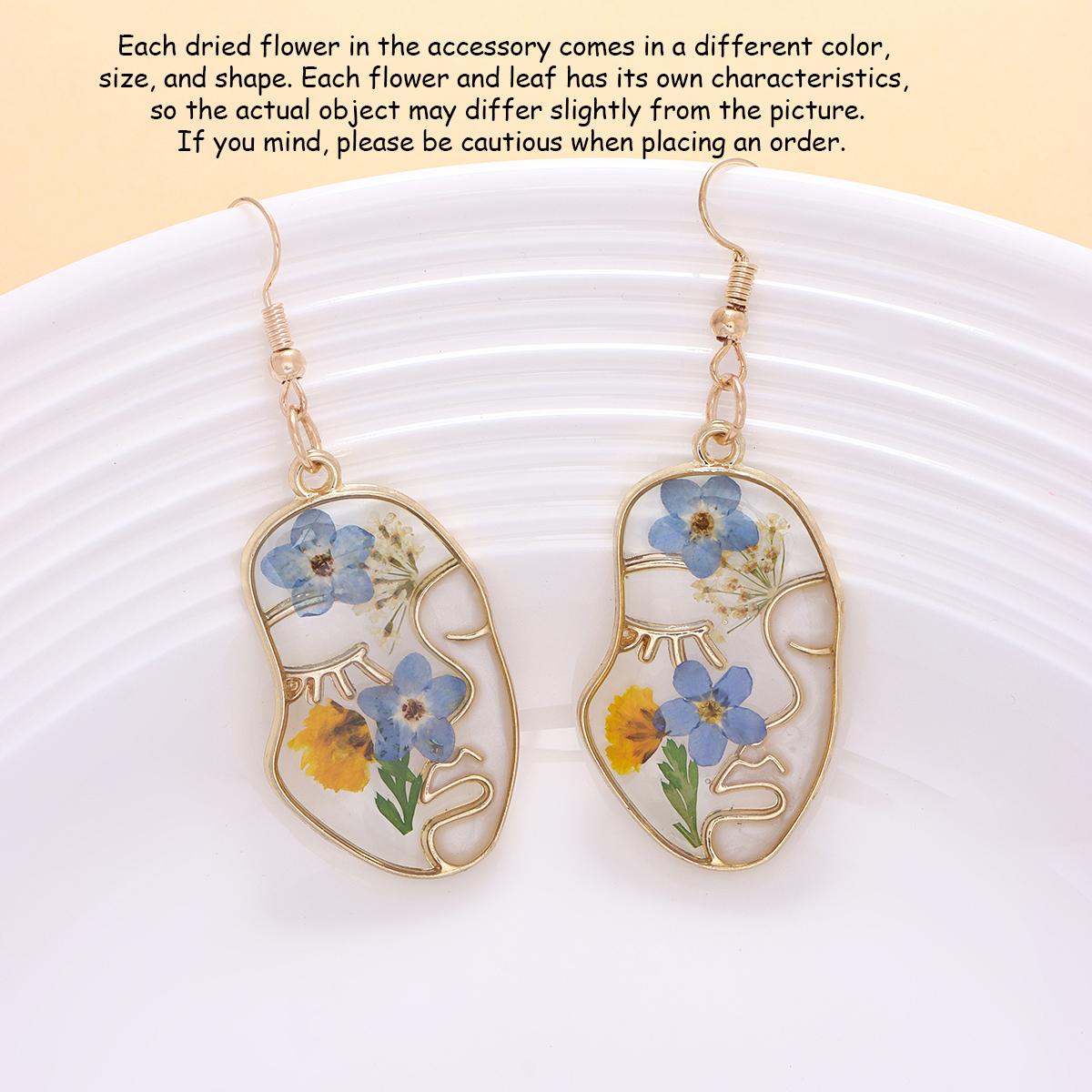 We use natural flowers and leaves. Every flower and leaf has its own characteristics, so the actual object may differ slightly from the picture, which is inevitable. We will make every effort to ensure the quality of the earrings, but we cannot guarantee that they are 100% consistent with the pictures. If you mind, please be cautious when placing an order. thank you.