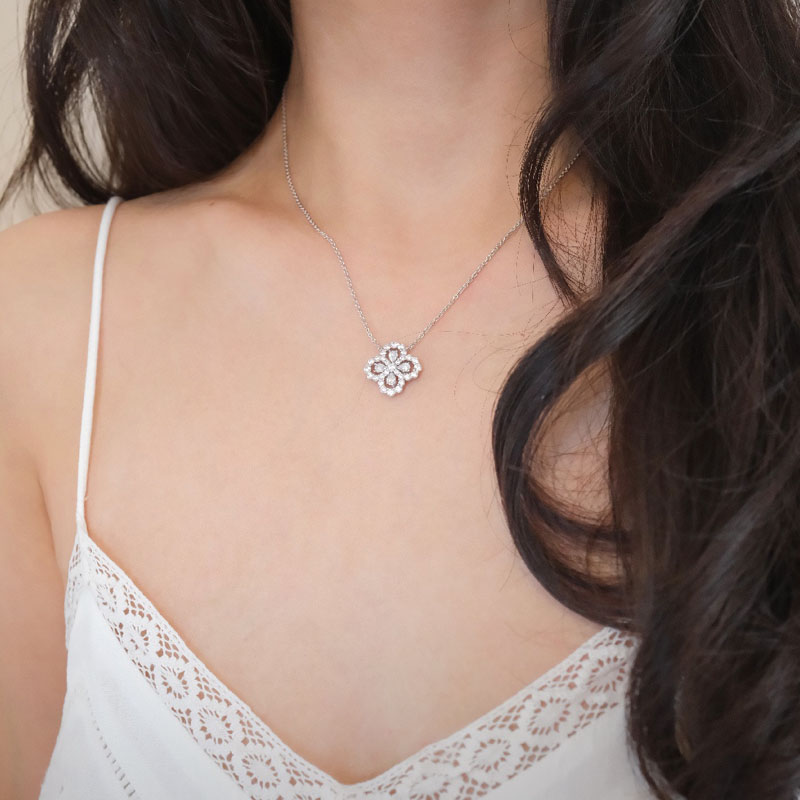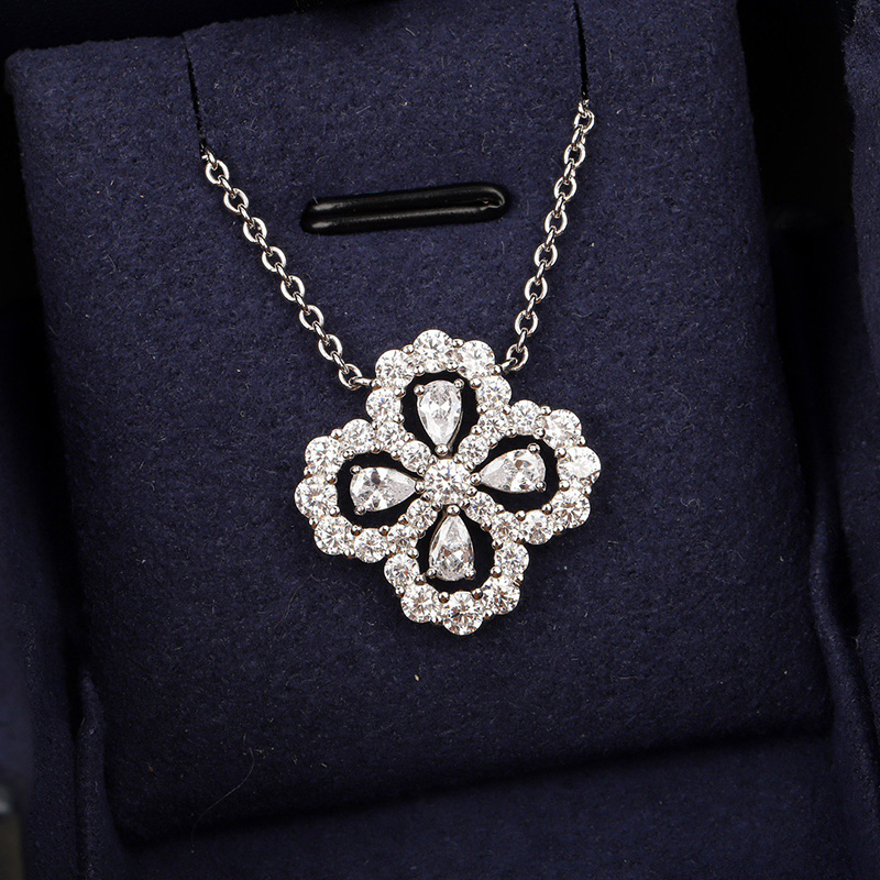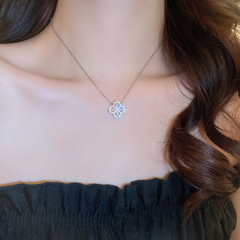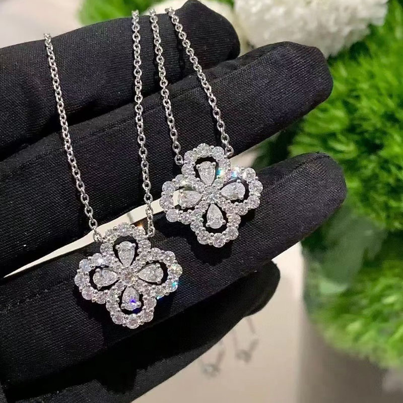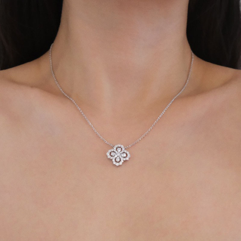 Sterling Silver Full Zircon Shiny Four Leaf Grass Lucky Flower Necklace